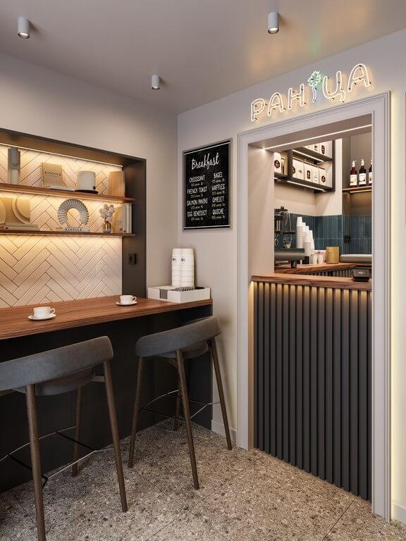 - Освещение: комбинированное — теплый свет в зоне обслуживания, акцентная подсветка декоративных элементов.