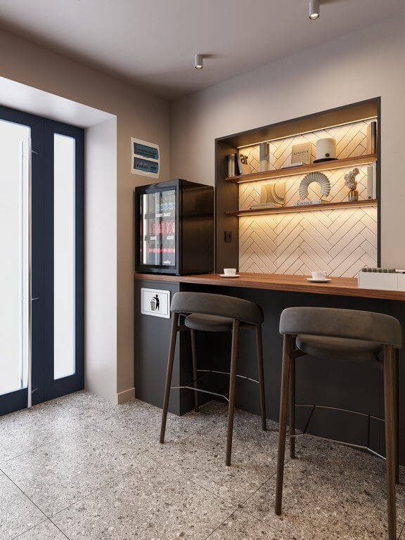 - Мебель: барные стулья с мягкой обивкой, деревянные панели с вертикальными ламелями, встроенные ниши и полки.