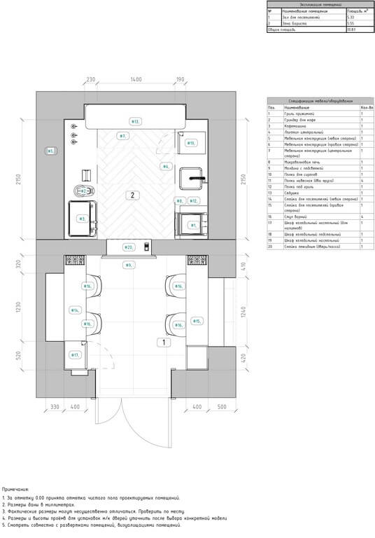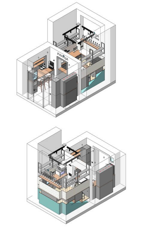 - Зонирование: выделены три ключевые зоны — барная стойка, зона ожидания/посадки, техническая зона (кухня, склад).