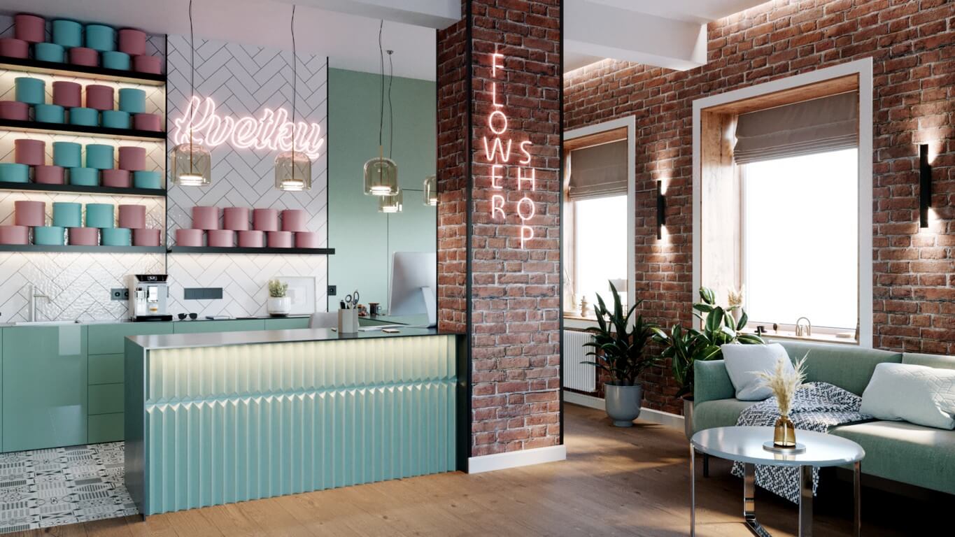 - Флористическая зона: расположена у центральной колонны с неоновой вывеской FLOWER SHOP. Здесь размещены композиции, горшечные растения и аксессуары.