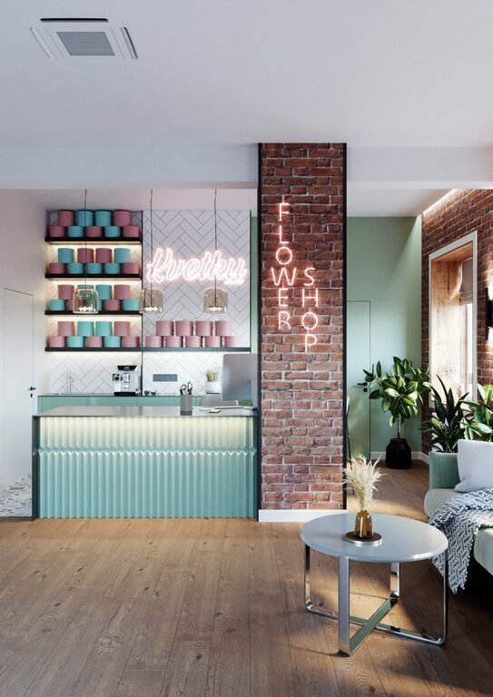 - Стены: кирпичная кладка, декоративные панели, акцентные зоны с неоновыми вывесками (sweetery, kvetin, kretku).