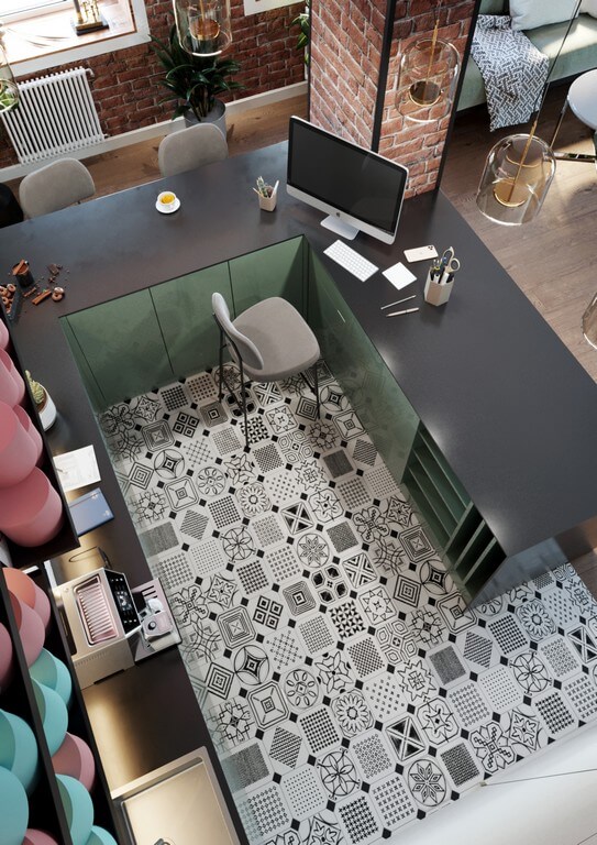 - Полы: комбинация деревянного покрытия и декоративной плитки с геометрическим орнаментом.