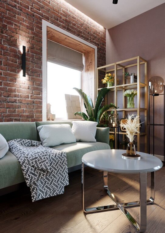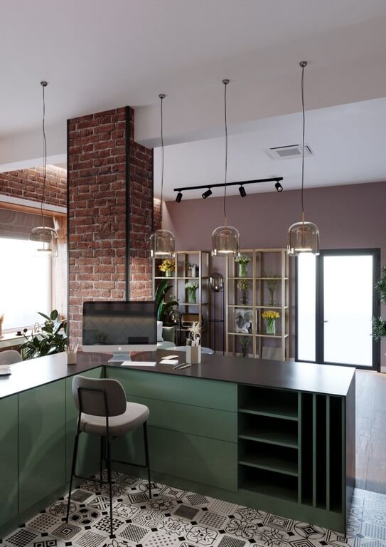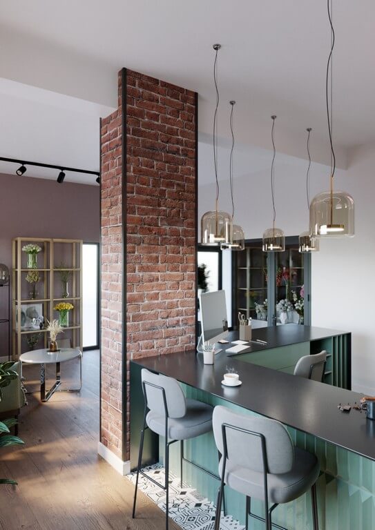 - Мебель: индивидуально подобранные элементы — барные стулья, диваны, столы, открытые стеллажи с декором и растениями.