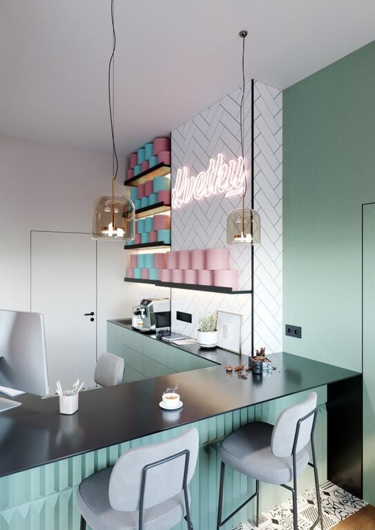 - Цветовая палитра: пастельные оттенки (мятный, розовый, лавандовый) в сочетании с натуральным деревом и белой плиткой в ёлочку.