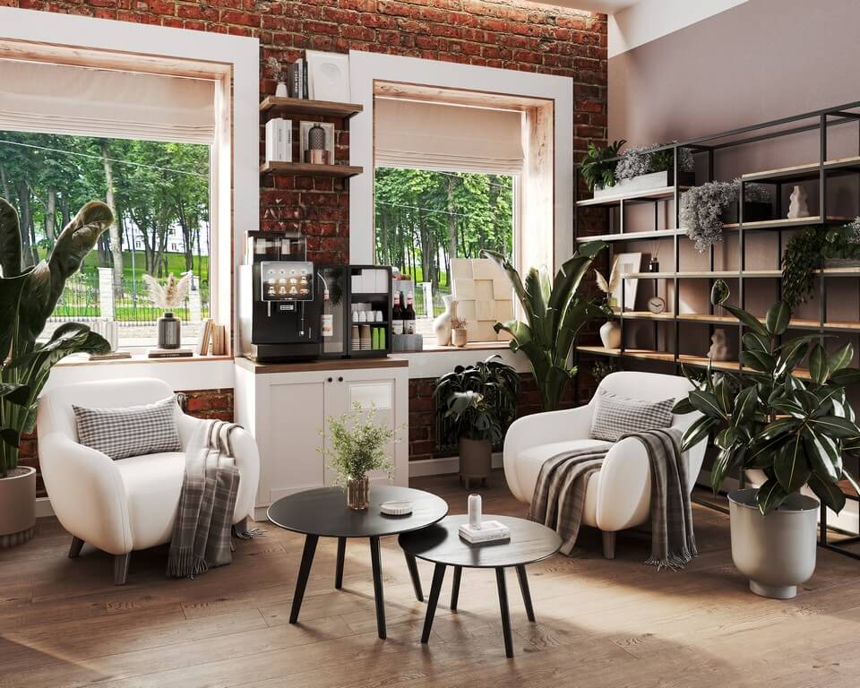 - Зона ожидания и отдыха: мягкие диваны, журнальные столики, декоративные подушки и пледы создают уютную атмосферу для общения и ожидания заказа.