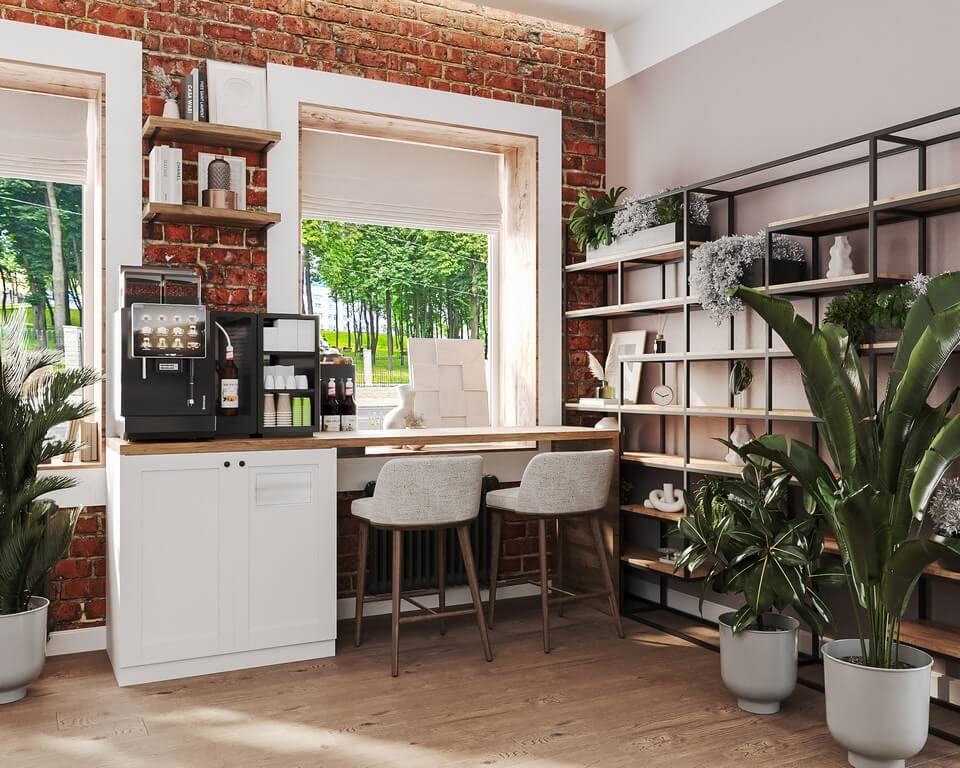 - Кафе-зона: включает барную стойку с рифленой панелью пастельно-зелёного цвета, кофемашину, витрину и посадочные места. Интерьер адаптирован под формат «coffee & flowers».