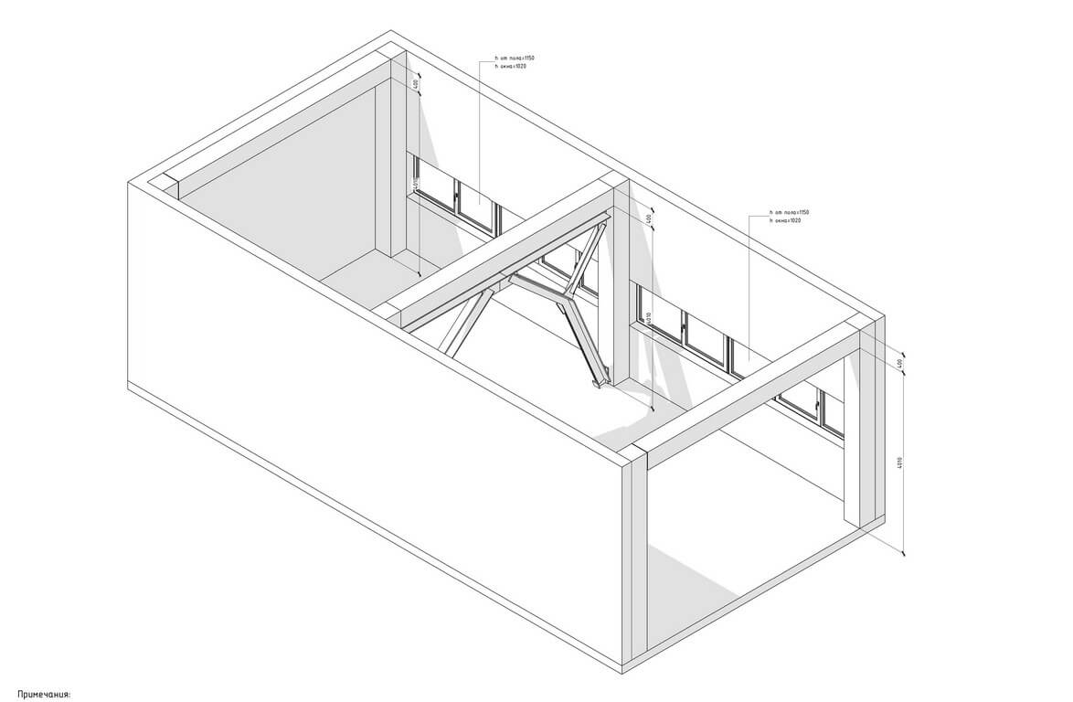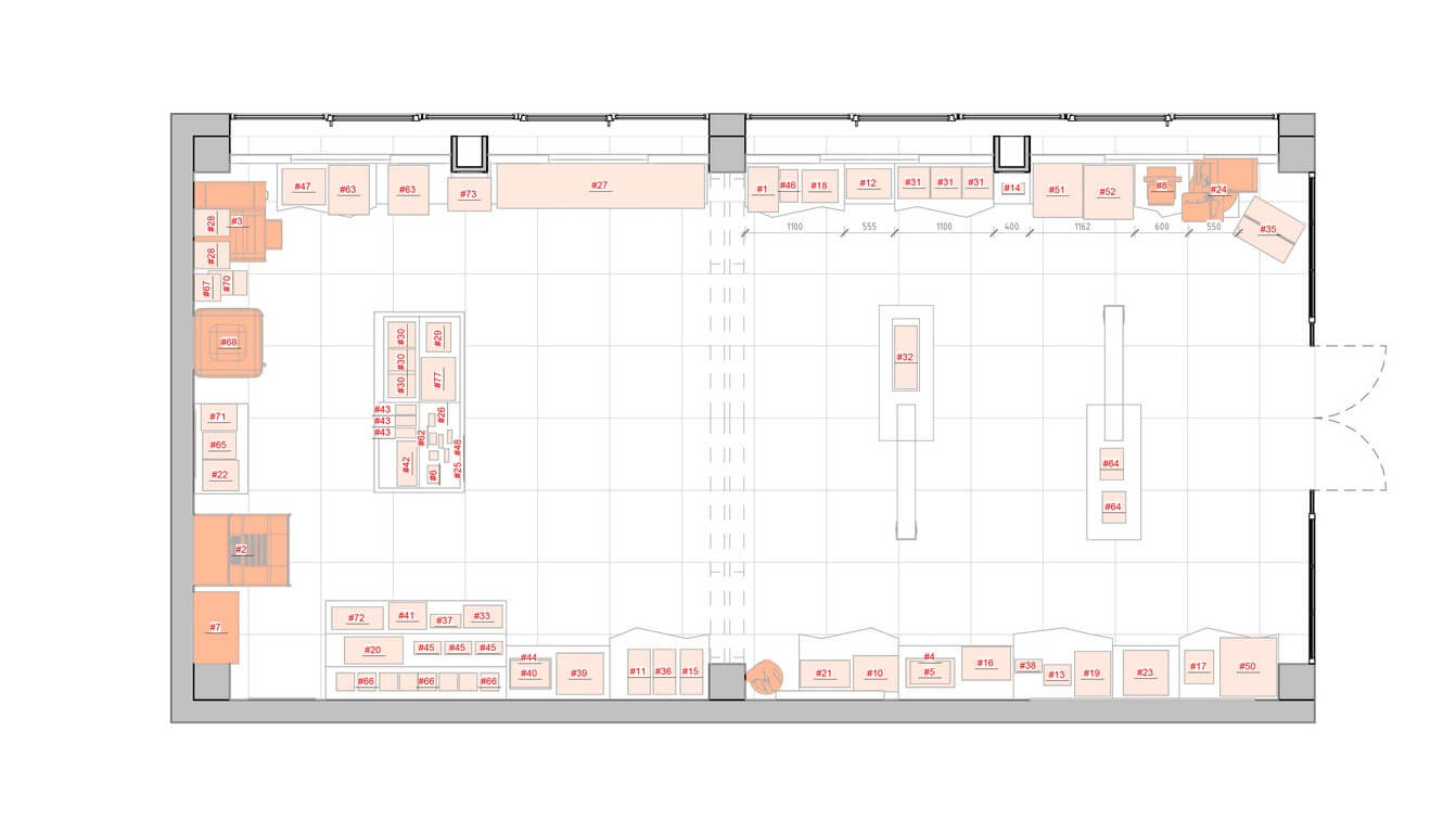 - Оформление: белые и синие платформы, черный потолок с трековыми светильниками, структурные балки.