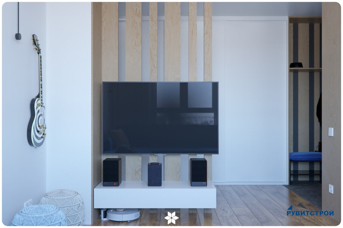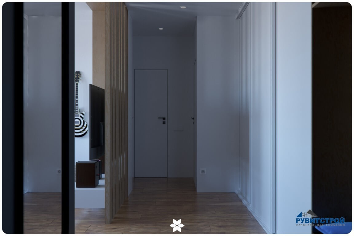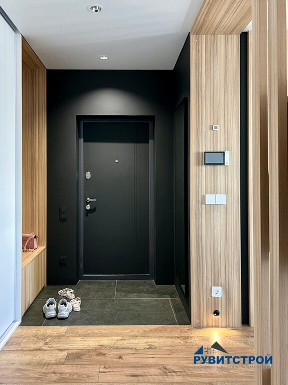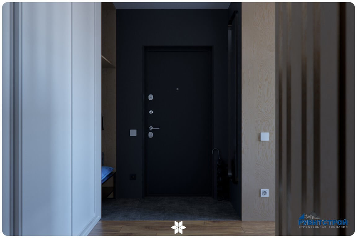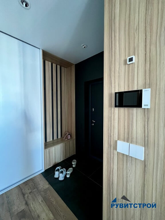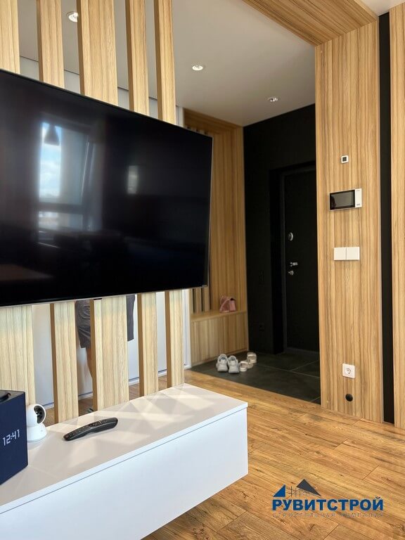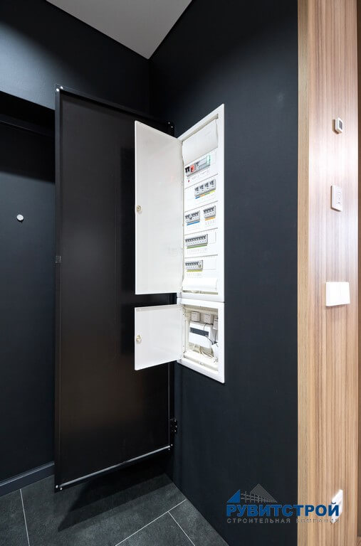 - Скрытый инженерный узел: электрический щит и слаботочные системы интегрированы в стену и скрыты за лаконичной панелью.