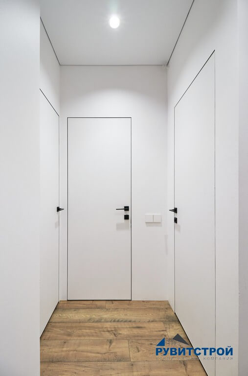 - Двери Invisible: установка скрытых дверных полотен в единой плоскости со стеной позволила визуально «растворить» входы в комнаты.