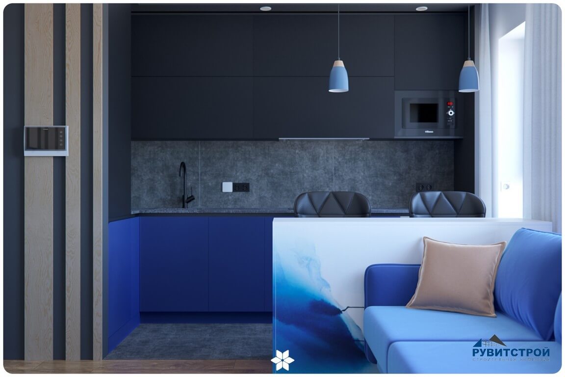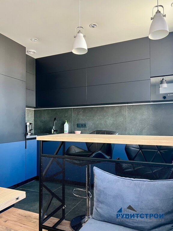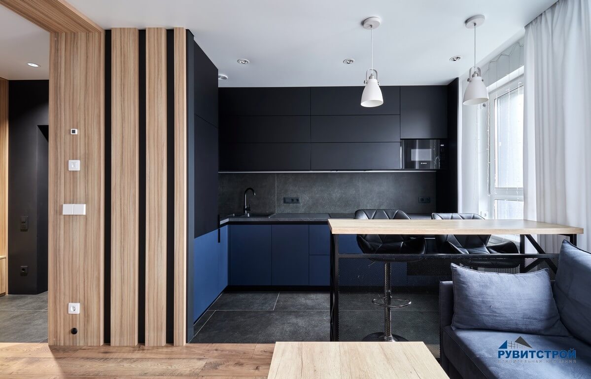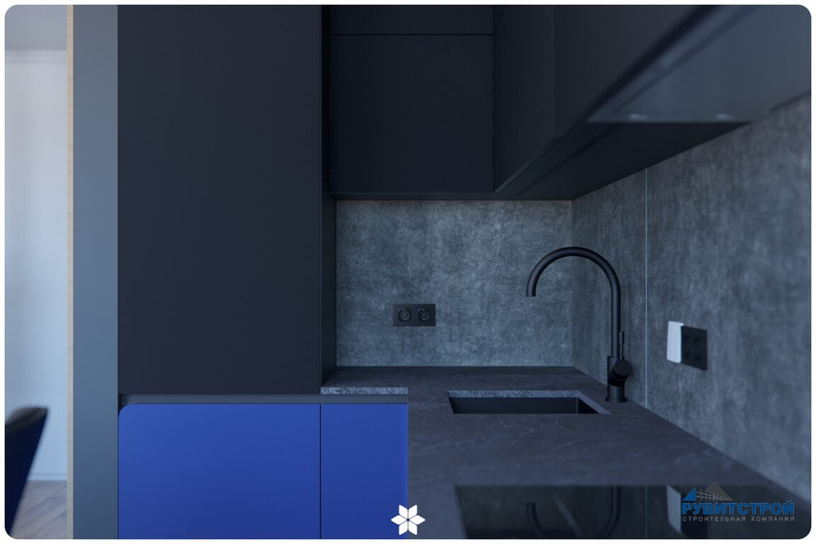 - Скрытая кухонная зона: графитовые фасады интегрированы в нишу, становясь архитектурным продолжением стен.