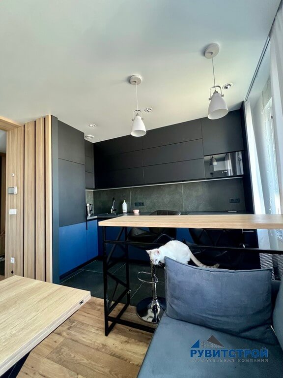 Центральное пространство квартиры объединяет зону приготовления пищи и место для отдыха. Основной акцент здесь сделан на точности стыковки мебели и строительных конструкций.