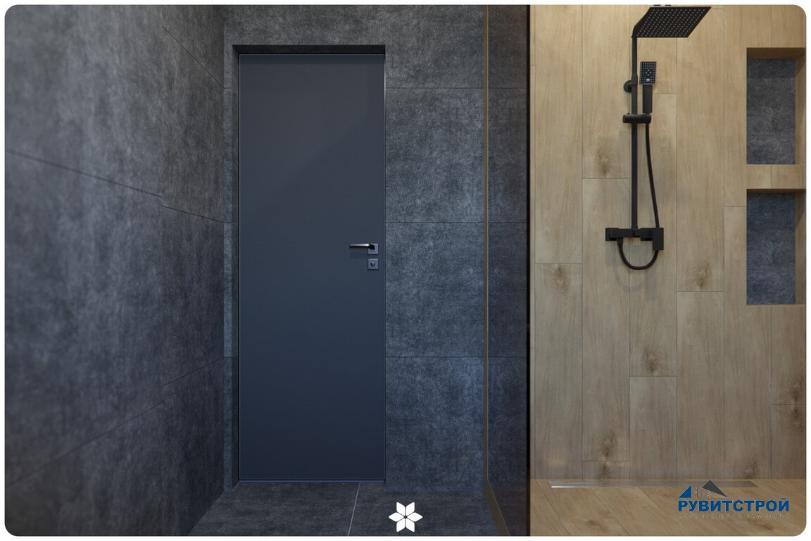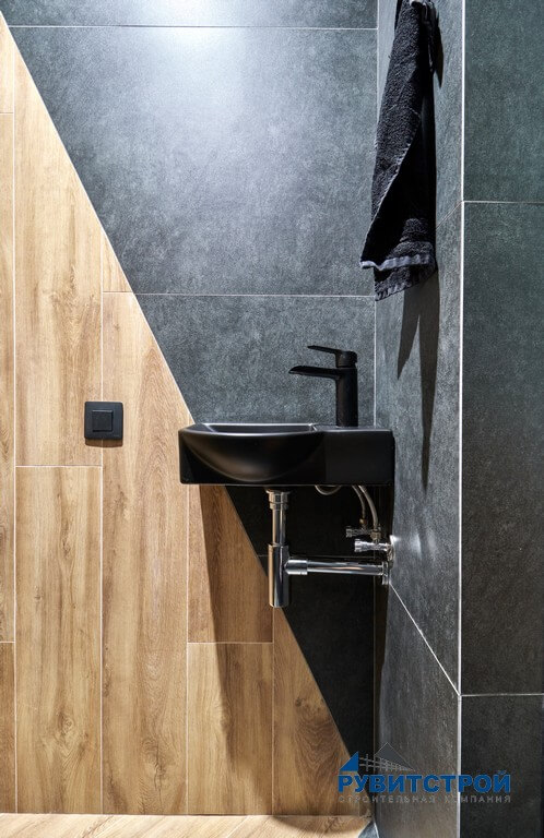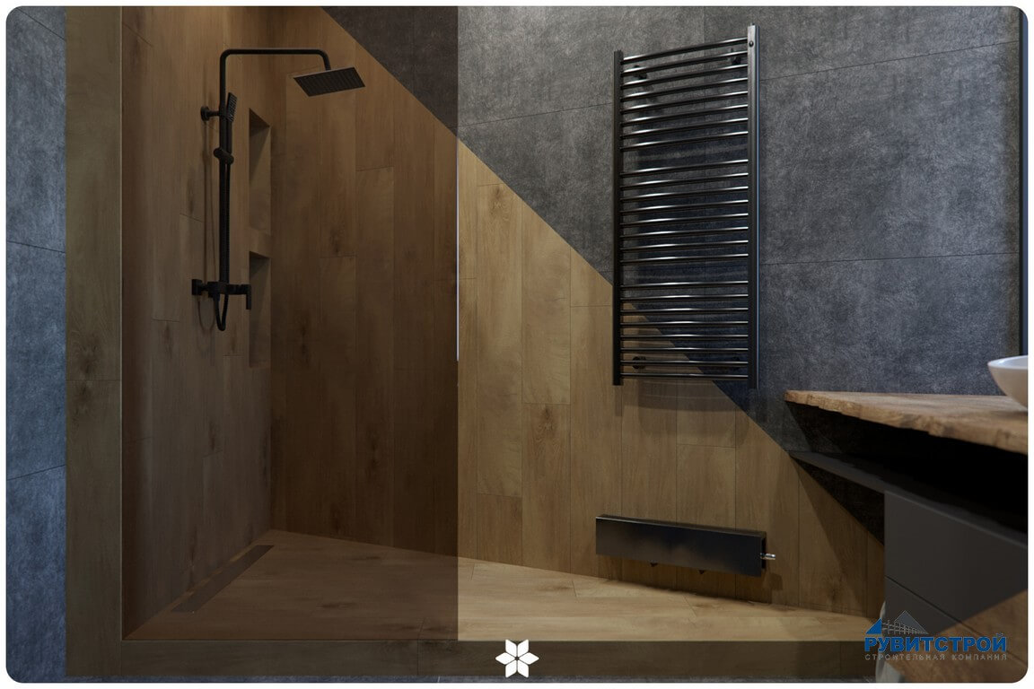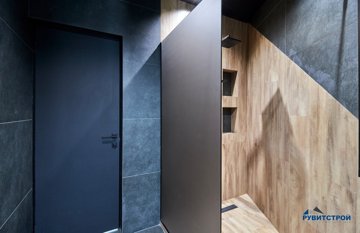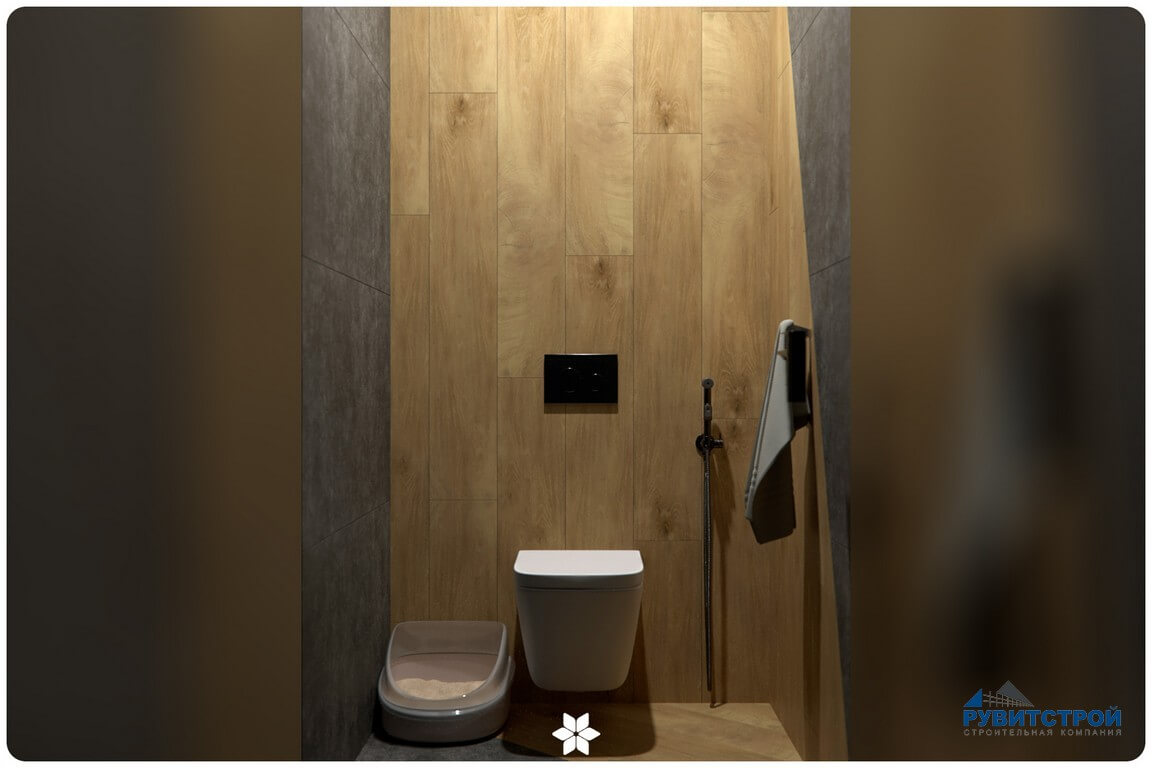 Санузел сочетает в себе высокие технологии и природные фактуры. Главный приоритет здесь — надежность инженерных систем.