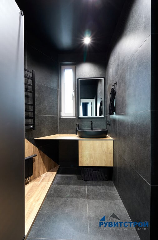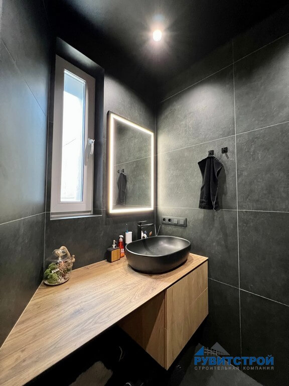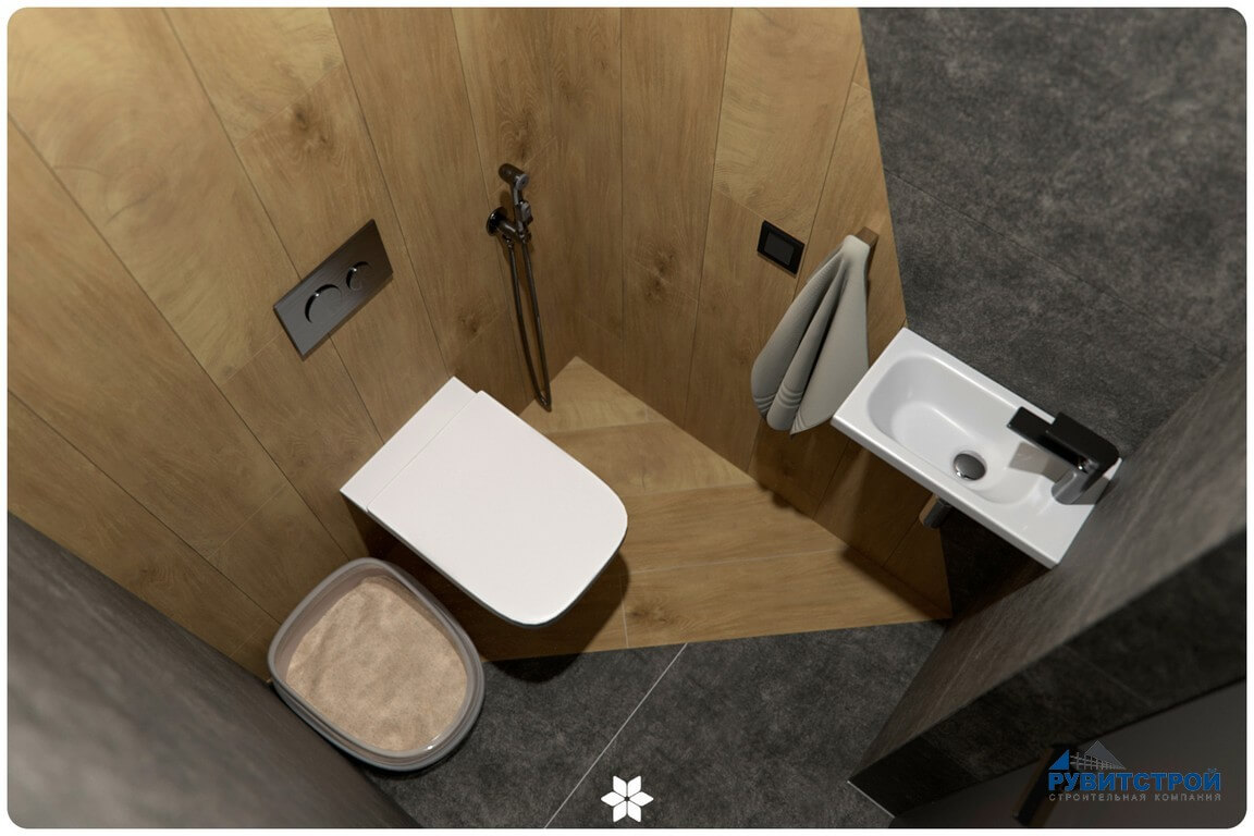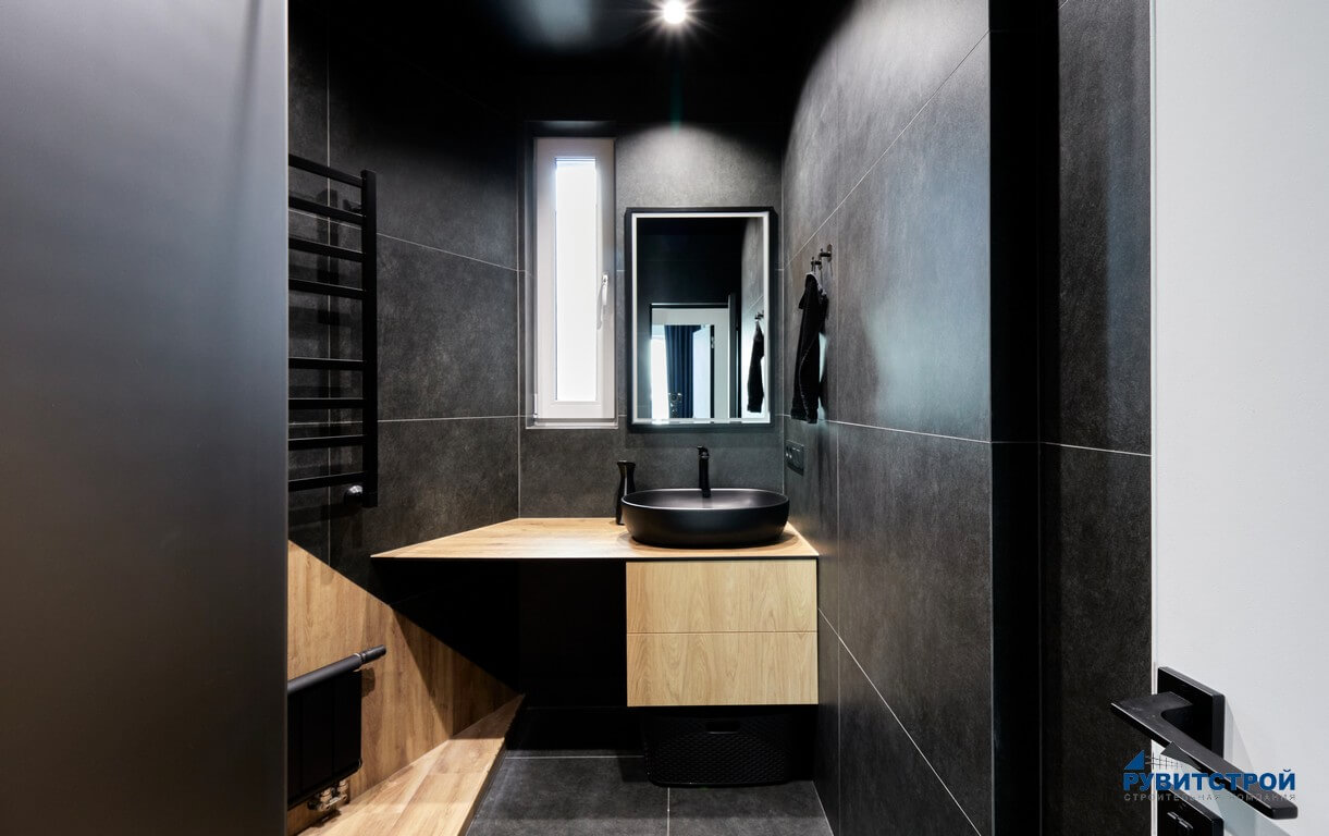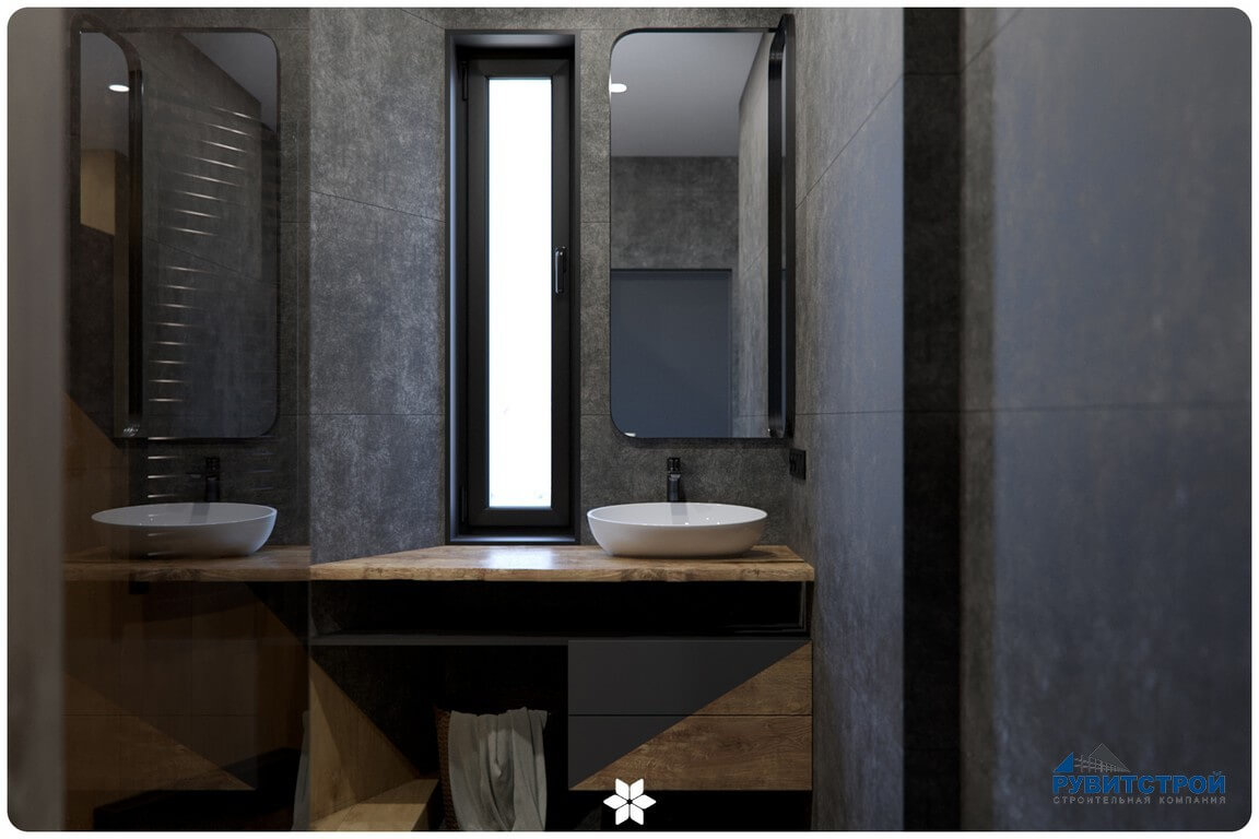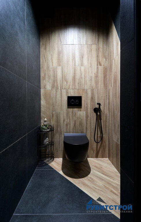Санузел сочетает в себе высокие технологии и природные фактуры. Главный приоритет здесь — надежность инженерных систем.
