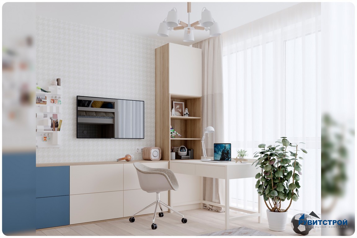 - Рабочее место. Стол интегрирован в общую мебельную группу и расположен у окна для максимального естественного света.