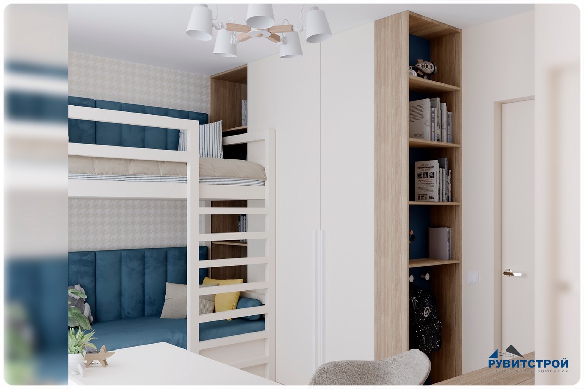 - Зона отдыха. Двухъярусная конструкция позволила выделить место для игр, сохранив полноценное спальное место. Мягкие стеновые панели глубокого синего цвета добавляют уюта и защищают от холодных стен.