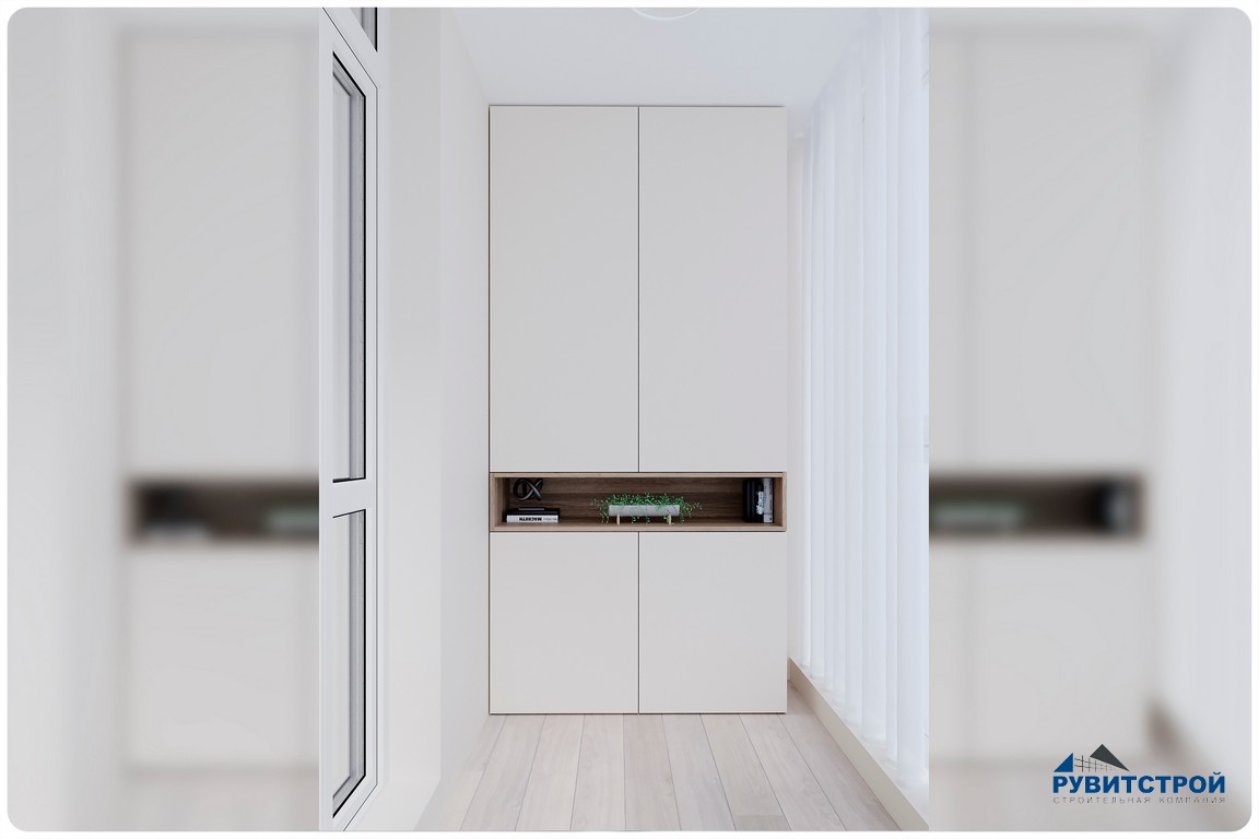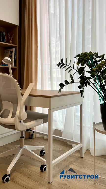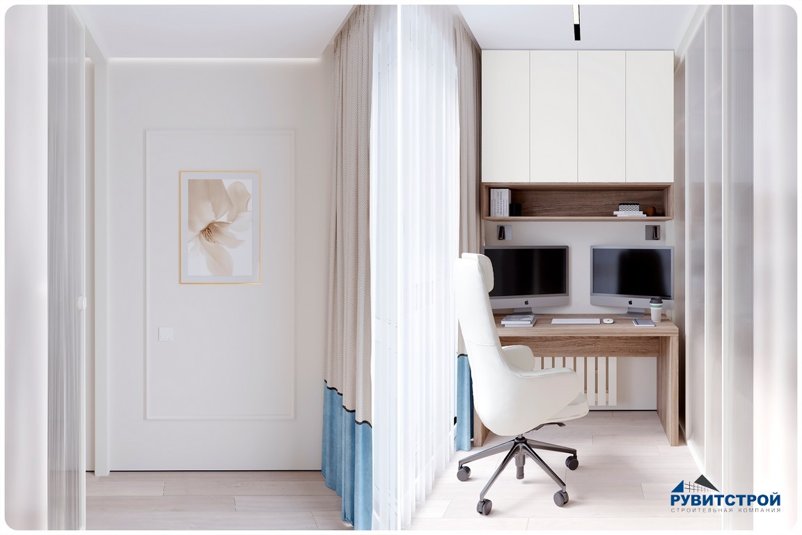 Мы полностью утеплили лоджию, превратив ее в изолированное рабочее место. Широкая столешница и продуманные системы хранения позволяют комфортно работать, не загромождая жилые комнаты. Стилистически кабинет продолжает общую линию квартиры за счет повторения древесных фактур.