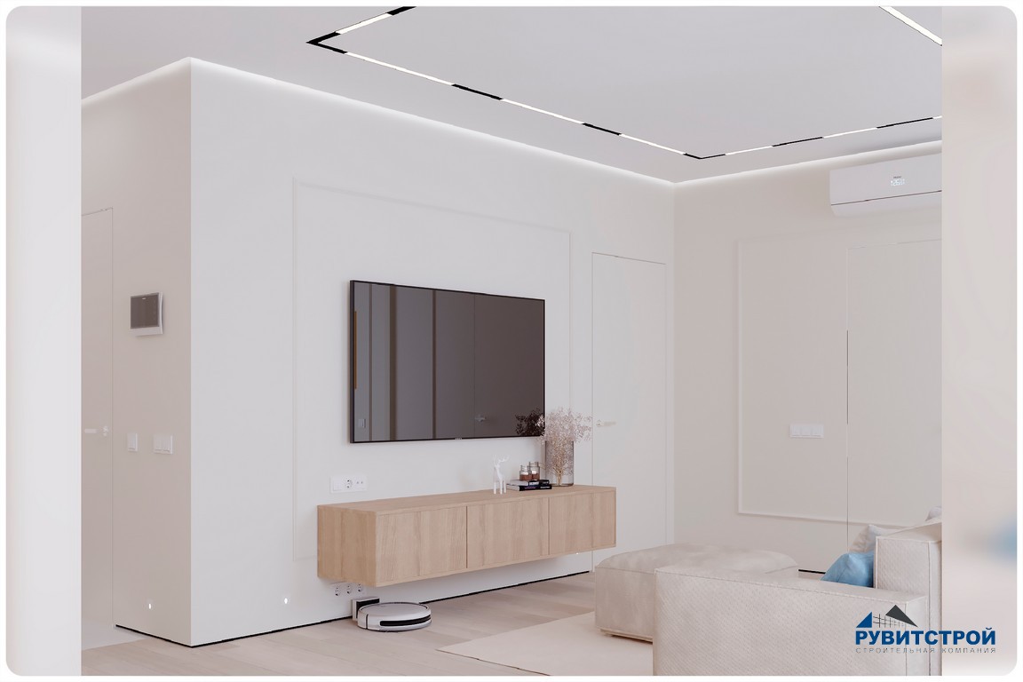 - Технологичное освещение. Мы реализовали сложную систему магнитных трековых светильников и закарнизной подсветки. Это позволяет менять сценарии освещения - от яркого рабочего до приглушенного вечернего.