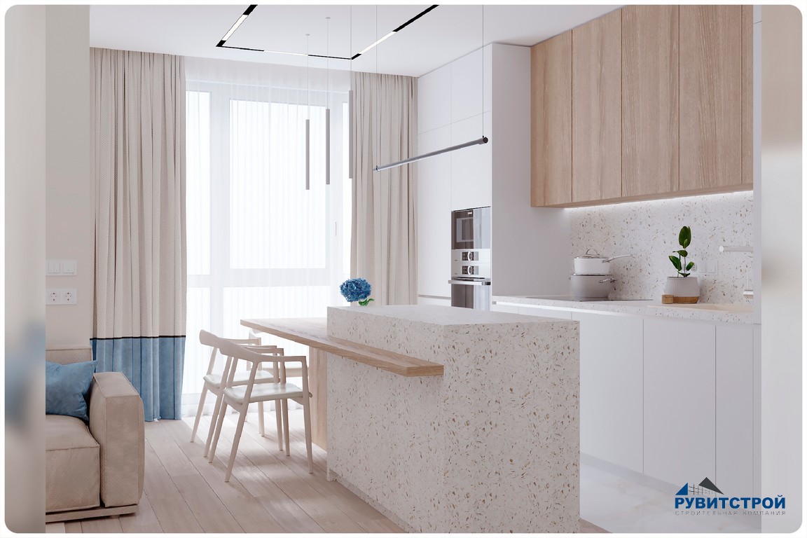 - Кухонный остров. Стал композиционным центром. Сочетание текстуры «терраццо» и деревянной барной стойки - не только стильно, но и практично.