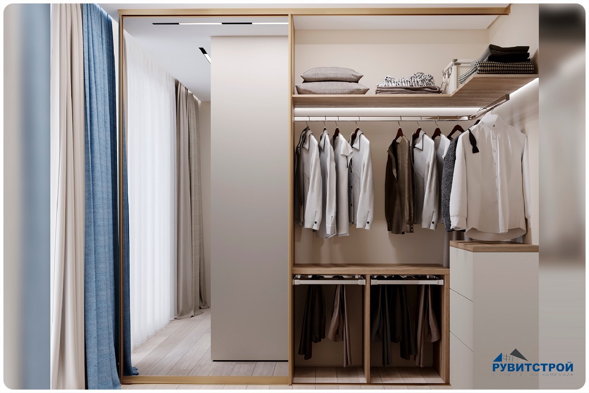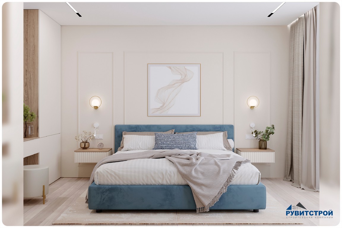 - Тактильность. В спальне акцент сделан на мягкое изголовье и сочетание вертикальных реек, что создает идеальную атмосферу для отдыха.