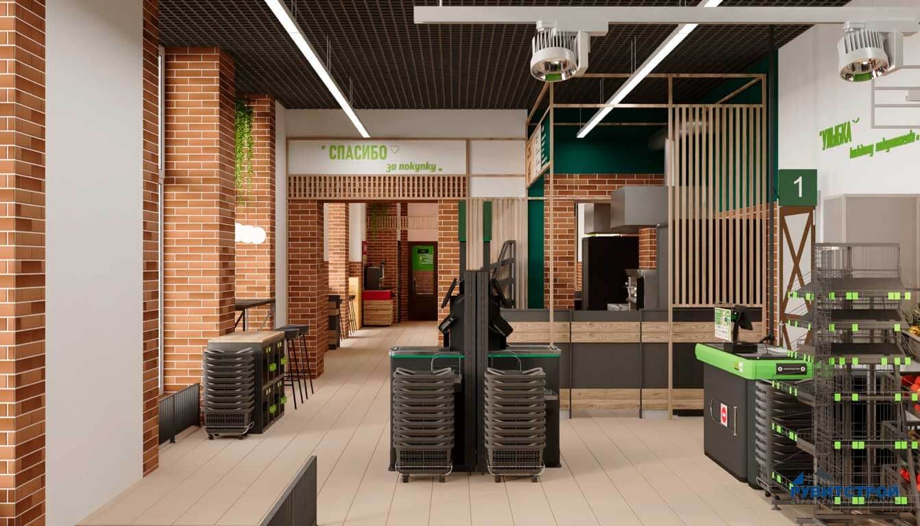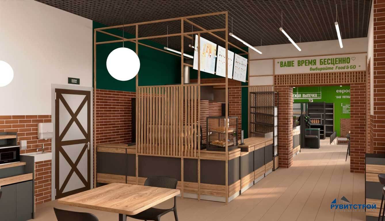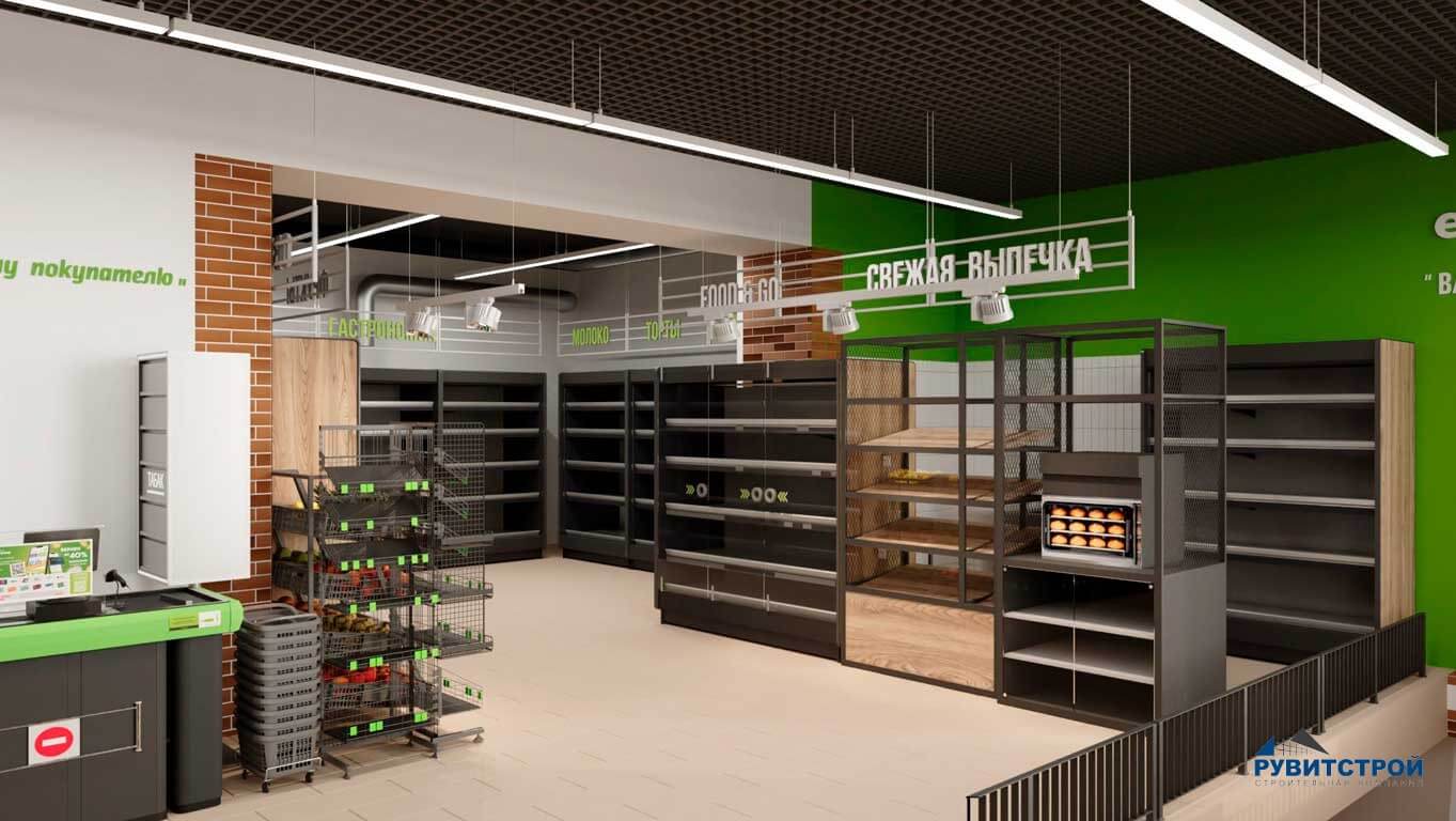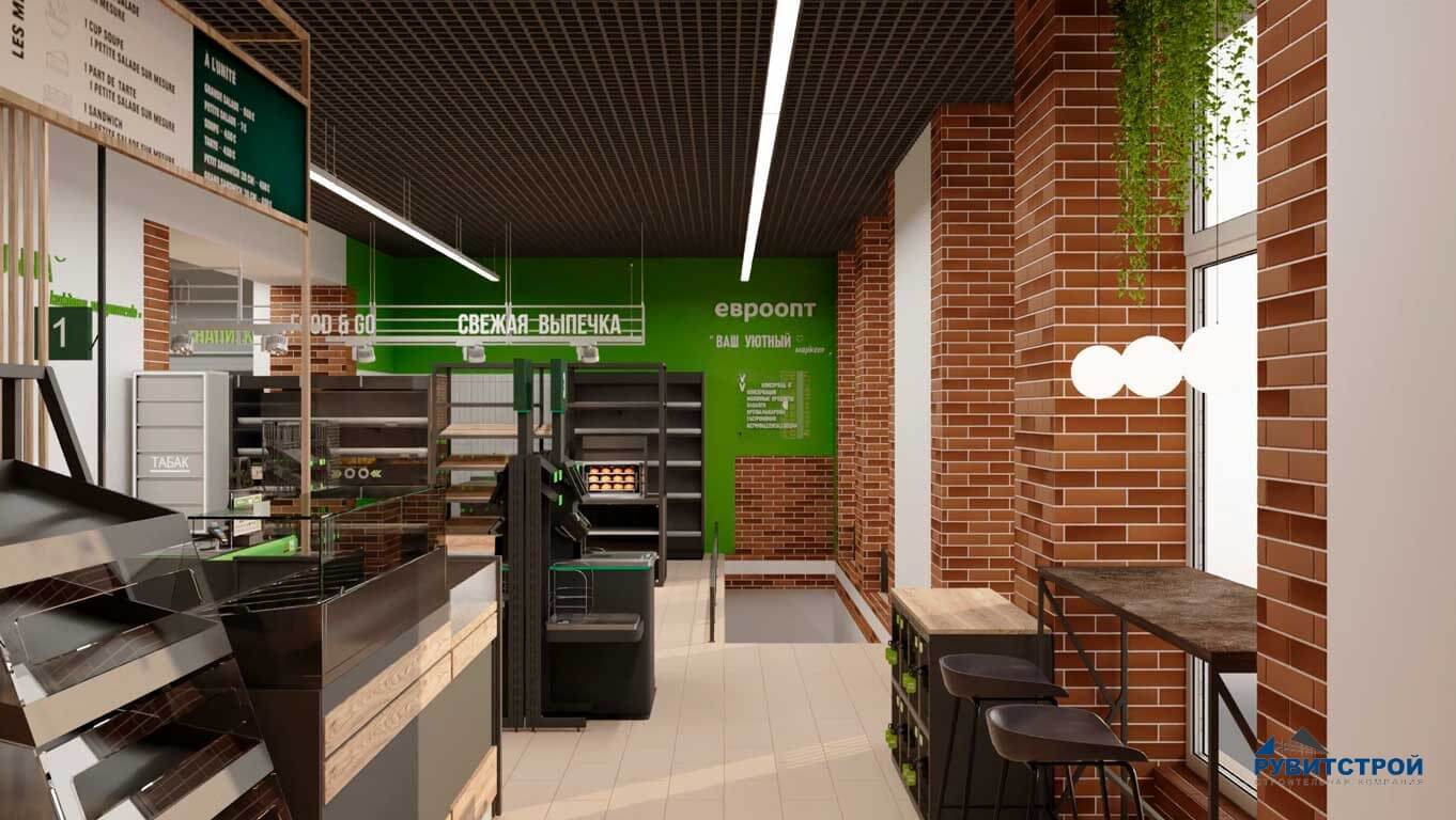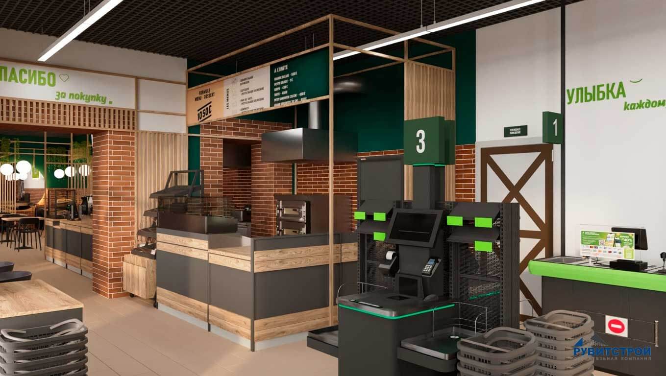 Задача: выполнить комплекс ремонтно-строительных и отделочных работ для реализации дизайн-проекта интерьера в стиле лофт-эко. Помещение должно объединять функциональность продуктового ритейла и уютную атмосферу городского кафе.