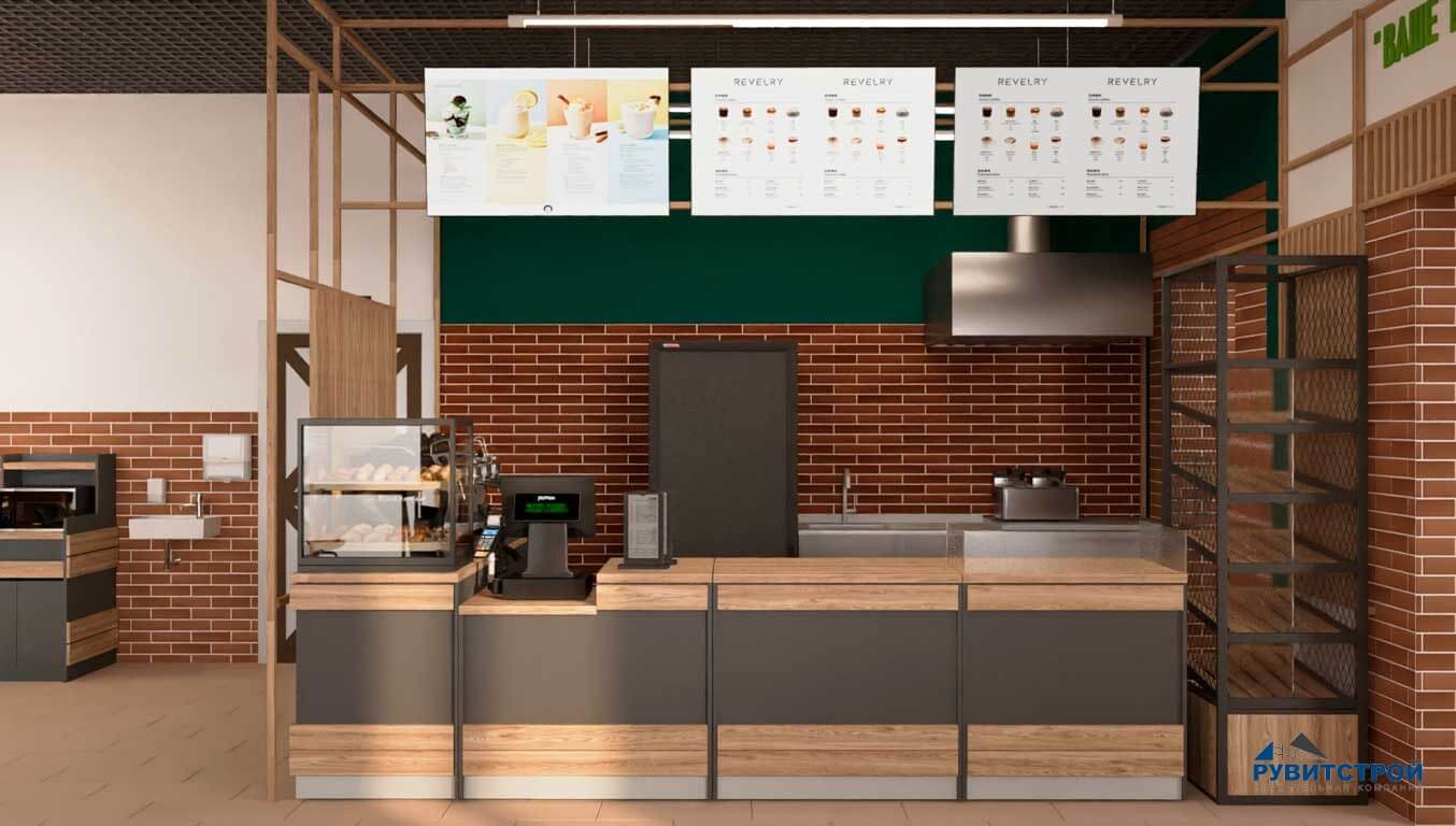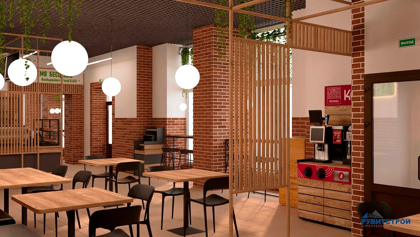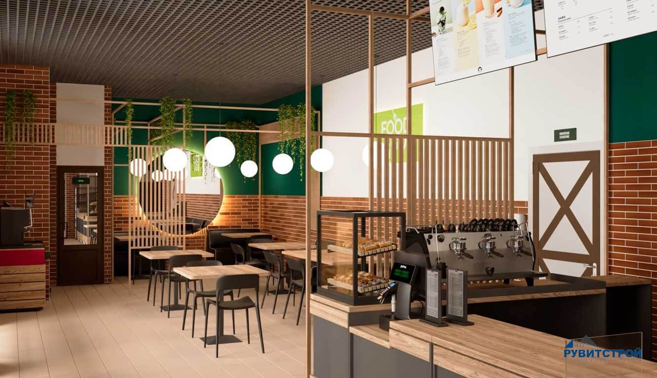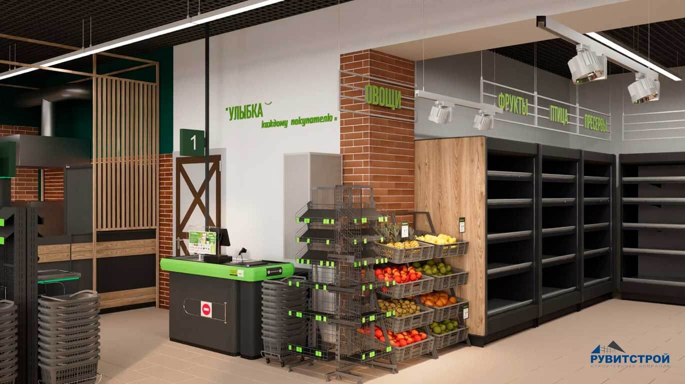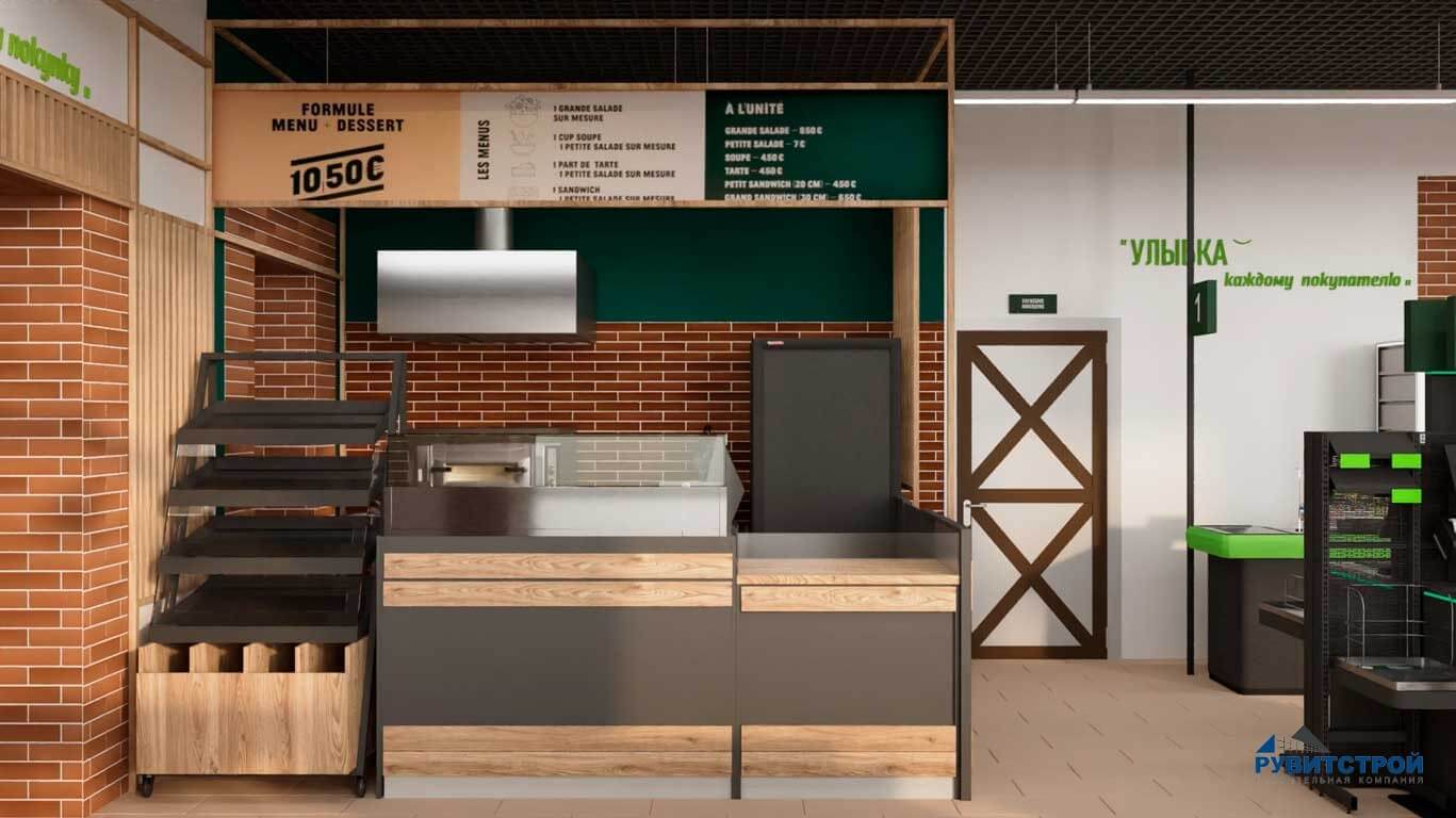 Задача: выполнить комплекс ремонтно-строительных и отделочных работ для реализации дизайн-проекта интерьера в стиле лофт-эко. Помещение должно объединять функциональность продуктового ритейла и уютную атмосферу городского кафе.