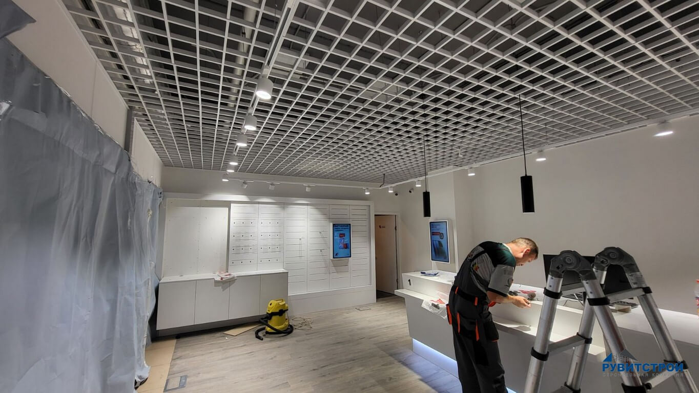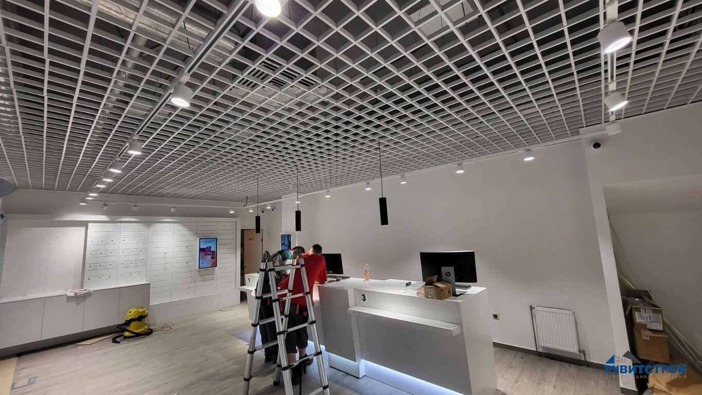 - Монтаж подвесных потолков Грильято по периметру стен в одной отметке с потолком из ГКЛ.