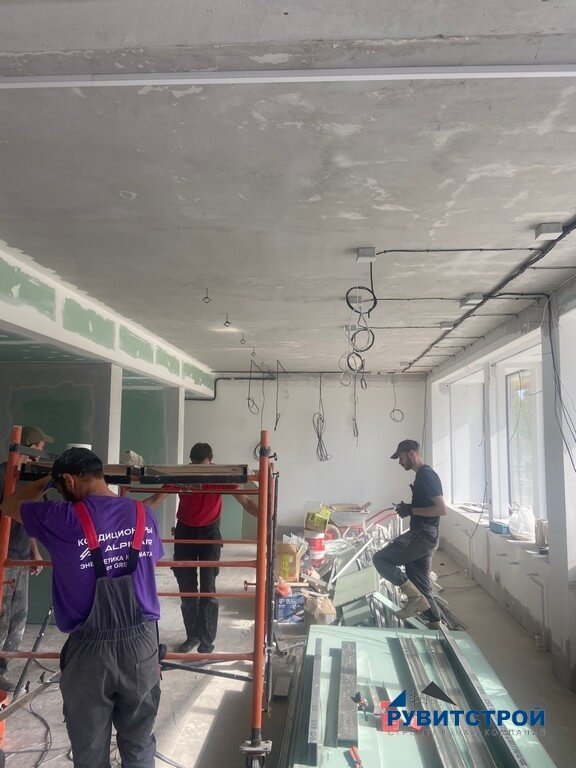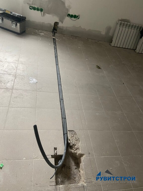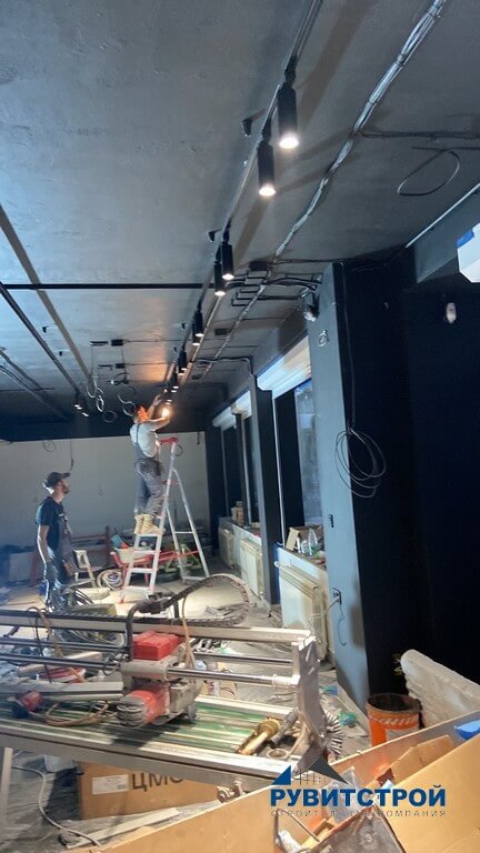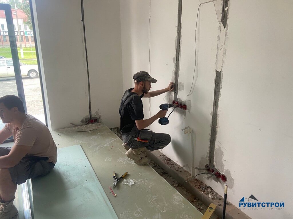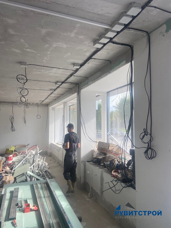 Выполнен демонтаж старой электросети. Смонтирована новая система электроснабжения в соответствии с проектом, включая освещение, розетки, силовые линии и слаботочные сети.